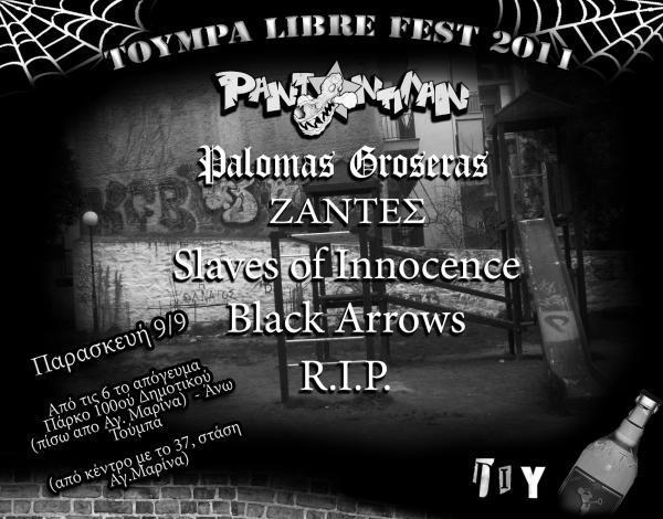 Σε μια ωραία κίνηση και με ένα ωραίο live εν'ονόματι "Τούμπα Libre fest" τα τσακαλάκια από έξι μπάντες ζωντανεύουν μια γειτονιά. Τα συγκροτήματα που θα πάρουν μέρος στη συναυλία είναι οι Ράντανπλαν, Palomas Groseras, Ζάντες, Slaves of innocence Black arrows και R.I.P. Η συναυλία είναι την Παρασκευή 9 Σεπτεμβρίου στο πάρκο του 100ού δημοτικού πίσω απο την Αγ.Μαρίνα στην Άνω Τούμπα. Όπως μας κατατοπίζει και το αφισάκι της συναυλίας πέρνουμε απο το κέντρο το 37 και κατεβαίνουμε στην στάση Αγία Μαρίνα.
